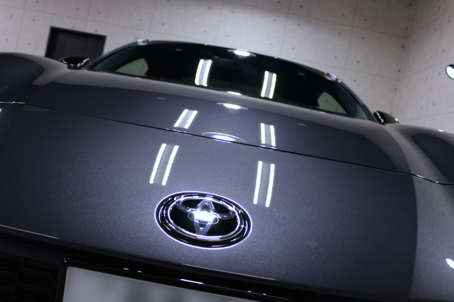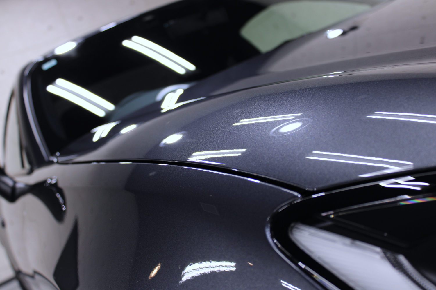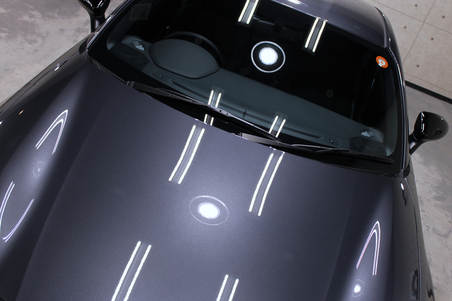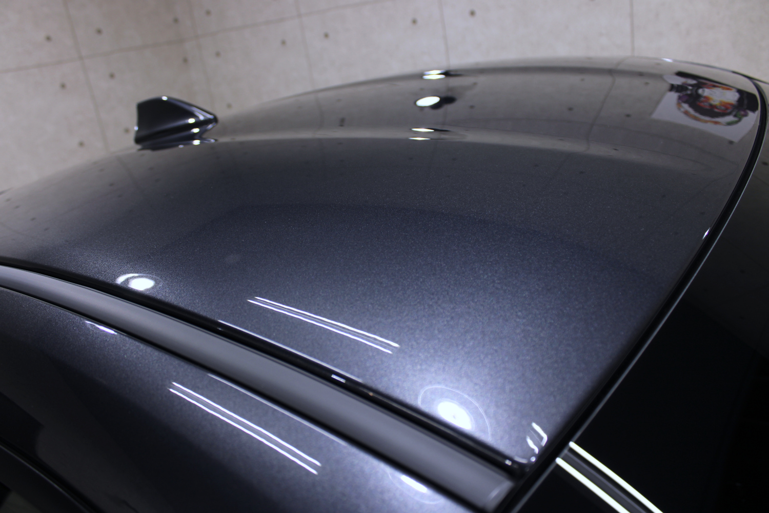 ガラスコーティングの「リボルト・プロ」の性能をそのまま引き継いだ上にセラミック成分を配合し、耐スリ傷、撥水性能、汚れ軽減、被膜定着、シミ軽減が強化されています。コーティング被膜はベースコート、トップコート、オーバートップコートからなる3層コーティングとなり、重厚感のある深い艶が特徴です。硬化が非常に速いため施工時は温度と湿度に注意し、圧倒的な被膜感を感じながら施工を実施、特殊LEDパネルを当てながら、ムラなく仕上げさせて頂きました。