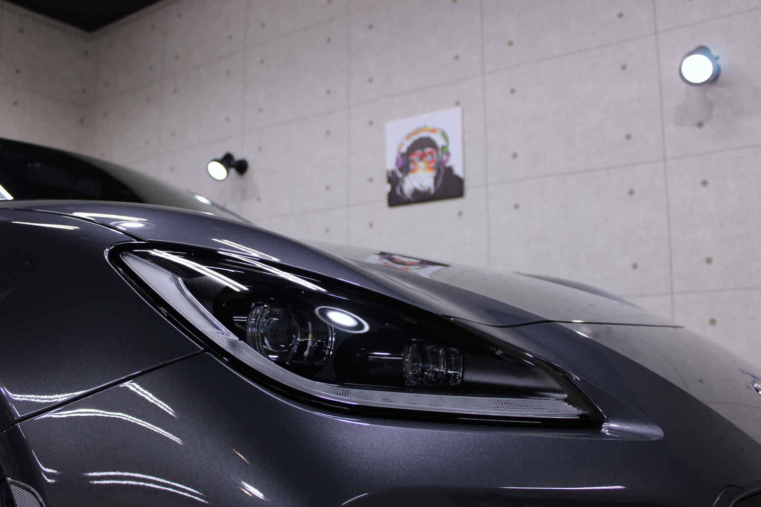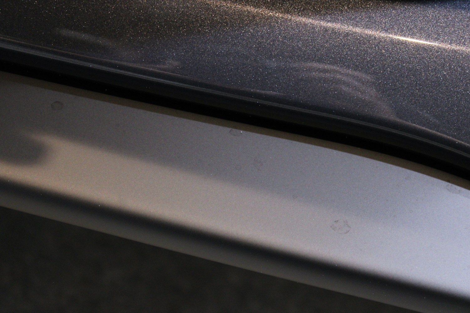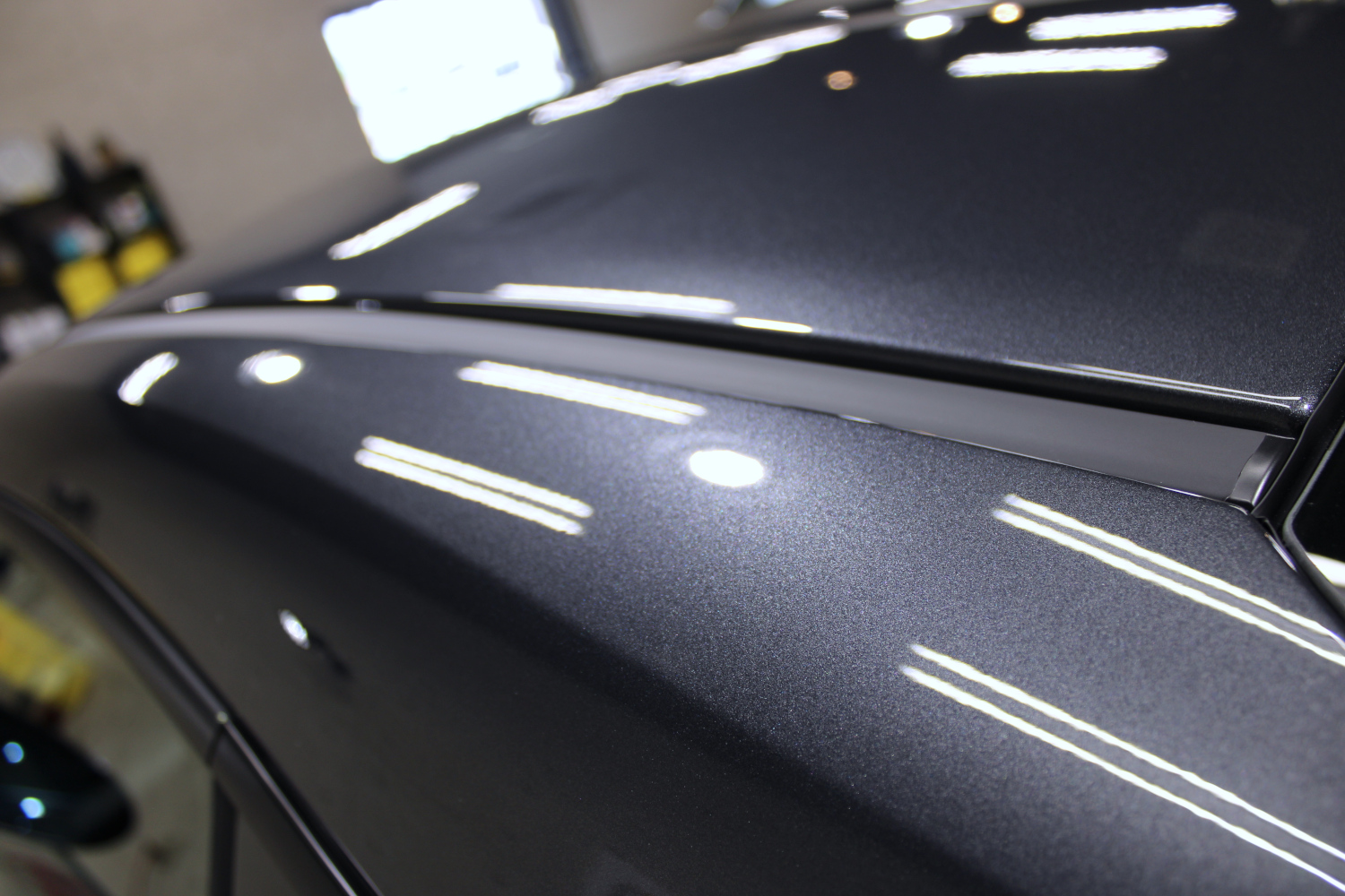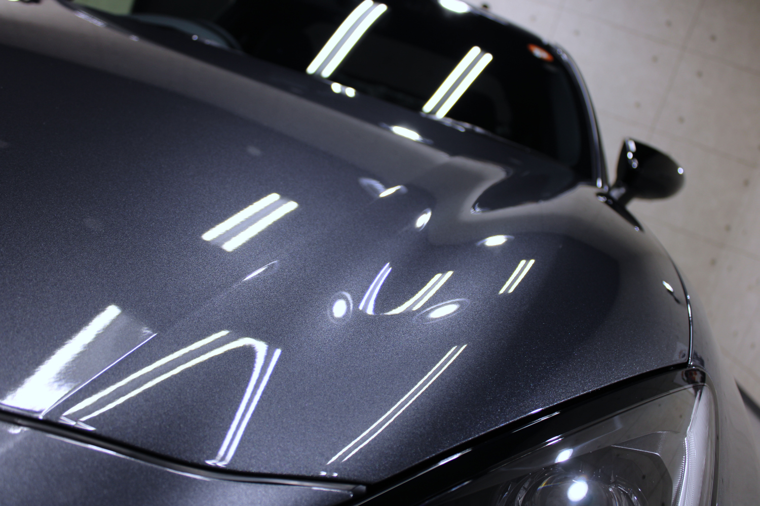 ガラスコーティングの「リボルト・プロ」の性能をそのまま引き継いだ上にセラミック成分を配合し、耐スリ傷、撥水性能、汚れ軽減、被膜定着、シミ軽減が強化されています。コーティング被膜はベースコート、トップコート、オーバートップコートからなる3層コーティングとなり、重厚感のある深い艶が特徴です。硬化が非常に速いため施工時は温度と湿度に注意し、圧倒的な被膜感を感じながら施工を実施、特殊LEDパネルを当てながら、ムラなく仕上げさせて頂きました。