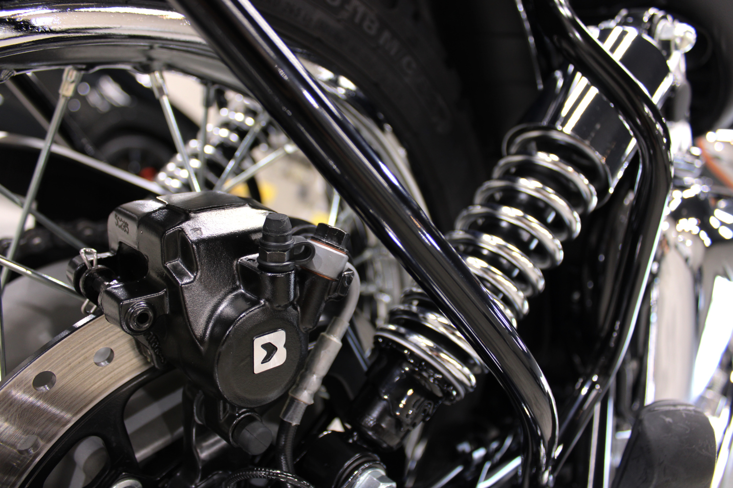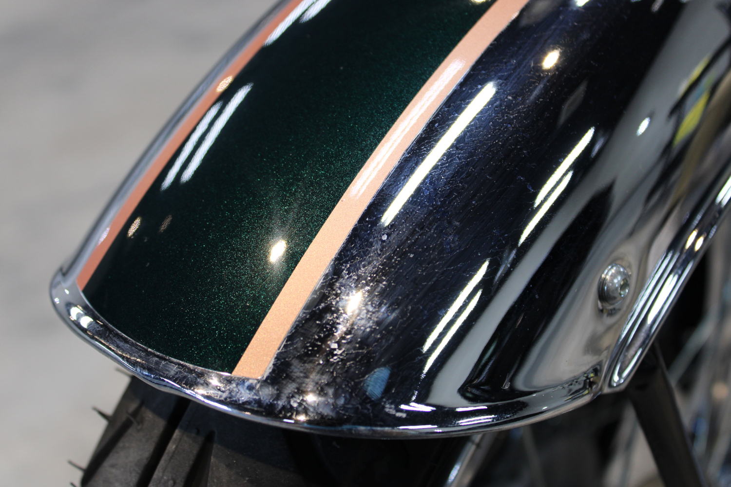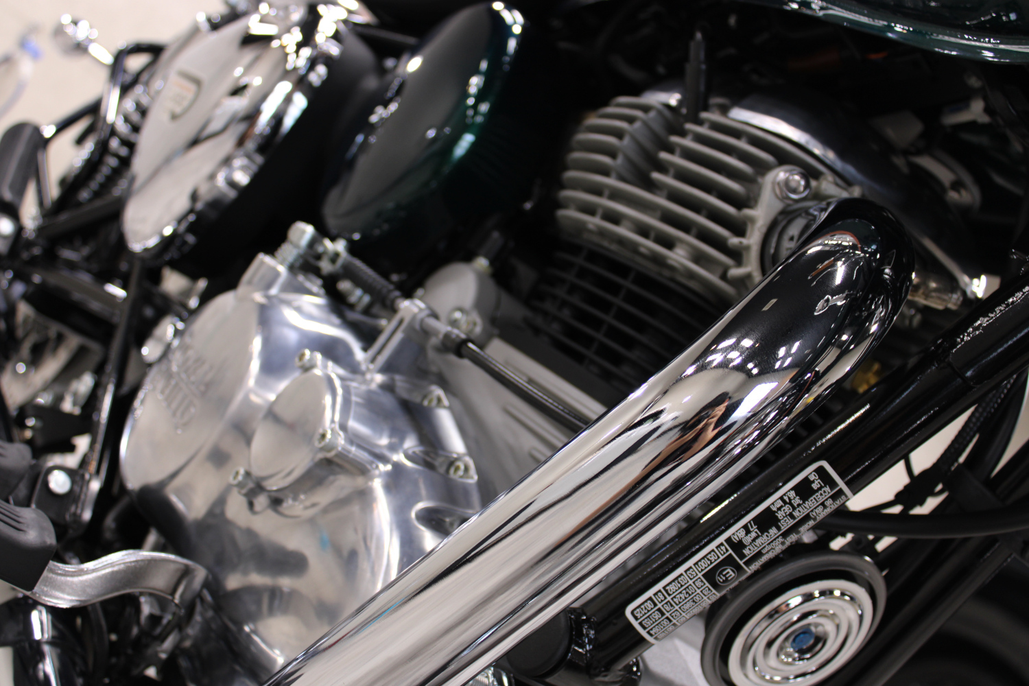 フロントフェンダーを始め、各所にメッキが用いられていますが、くすみが見受けられましたので専用クリーナーを用いて綺麗にさせていただきました。