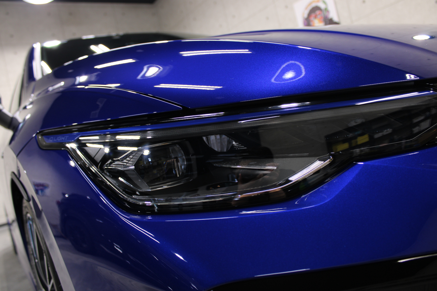 ガラスコーティングの「リボルト・プロ」の性能をそのまま引き継いだ上にセラミック成分を配合し、耐スリ傷、撥水性能、汚れ軽減、被膜定着、シミ軽減が強化されています。コーティング被膜はベースコート、トップコート、オーバートップコートからなる3層コーティングとなり、重厚感のある深い艶が特徴です。硬化が非常に速いため施工時は温度と湿度に注意し、圧倒的な被膜感を感じながら施工を実施、特殊LEDパネルを当てながら、ムラなく仕上げさせて頂きました。