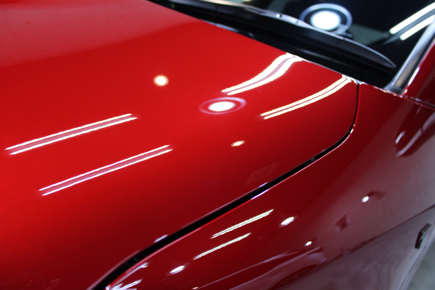 ガラスコーティングの「リボルト・プロ」の性能をそのまま引き継いだ上にセラミック成分を配合し、耐スリ傷、撥水性能、汚れ軽減、被膜定着、シミ軽減が強化されています。コーティング被膜はベースコート、トップコート、オーバートップコートからなる3層コーティングとなり、重厚感のある深い艶が特徴です。硬化が非常に速いため施工時は温度と湿度に注意し、圧倒的な被膜感を感じながら施工を実施、特殊LEDパネルを当てながら、ムラなく仕上げさせて頂きました。