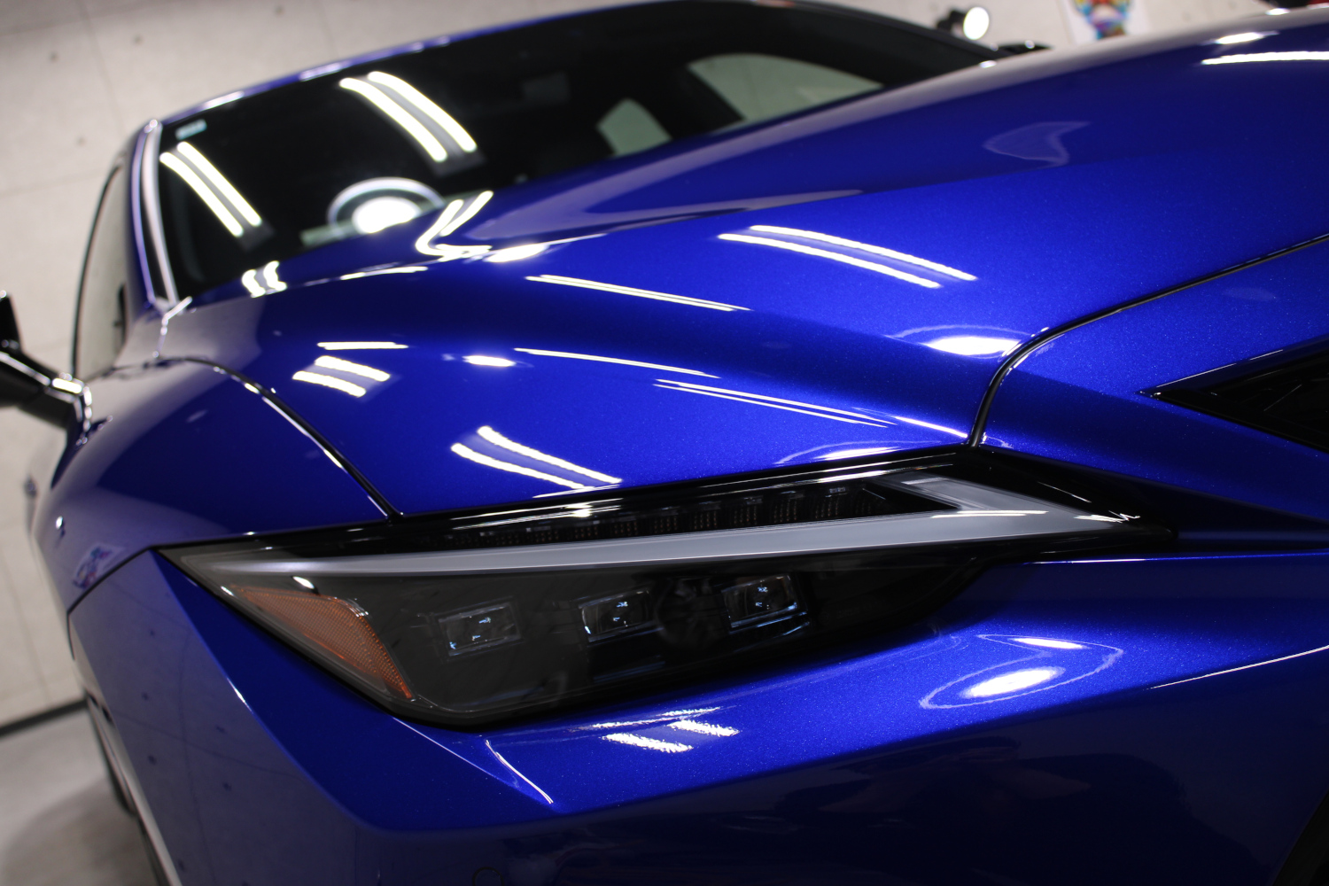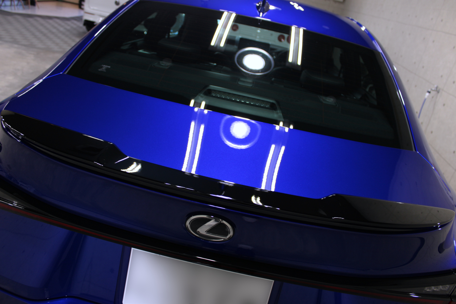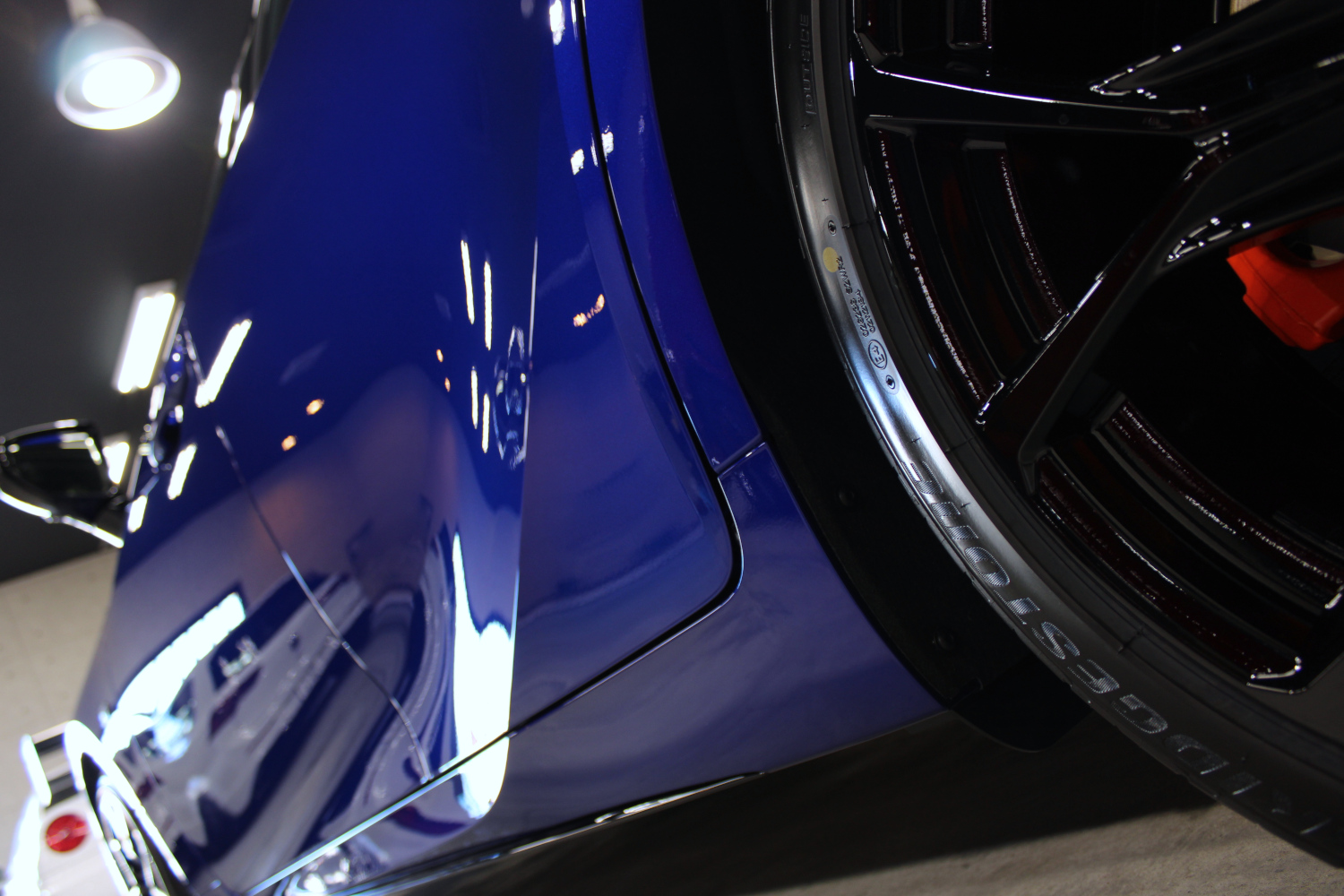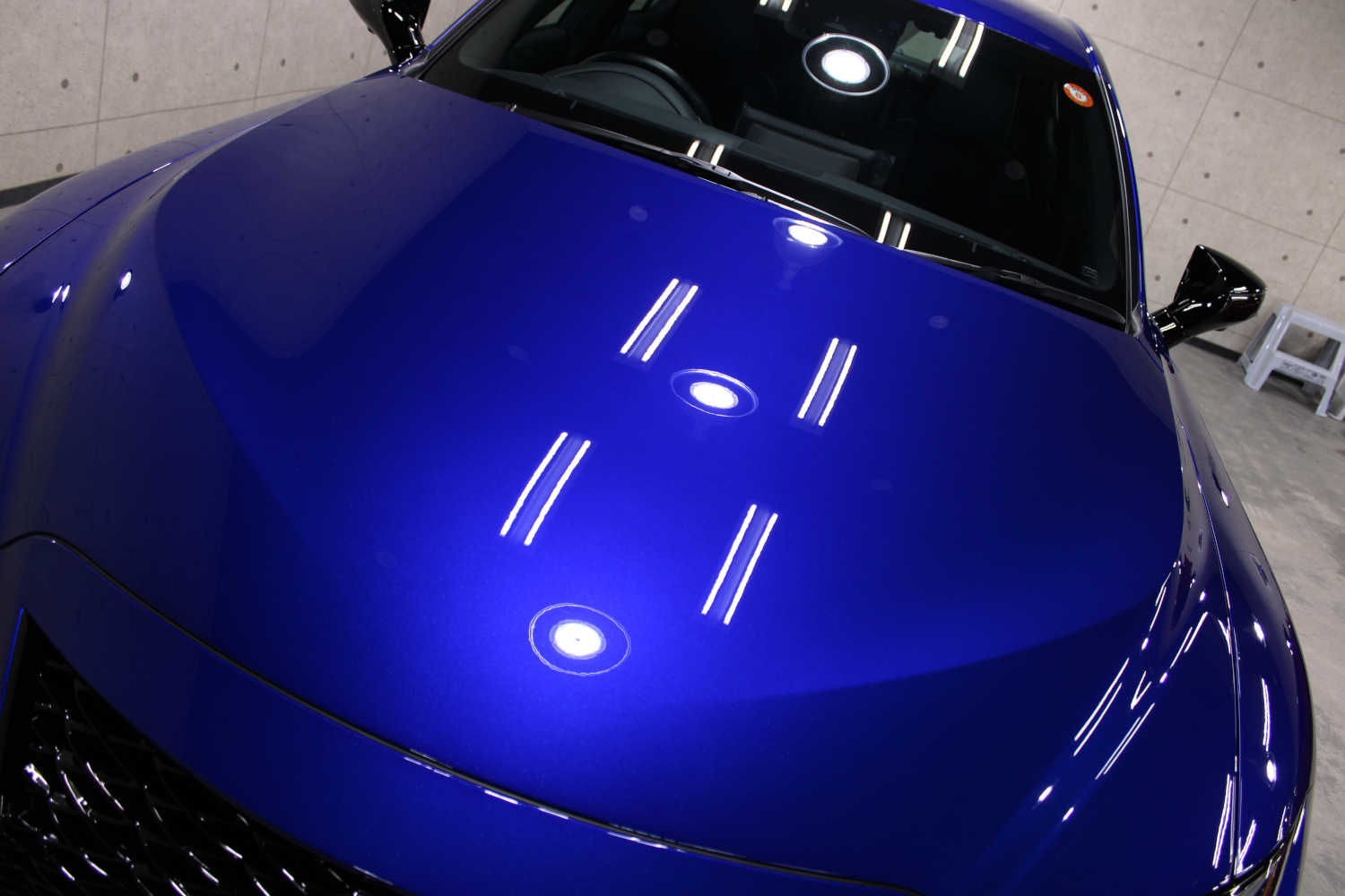 ガラスコーティングの「リボルト・プロ」の性能をそのまま引き継いだ上にセラミック成分を配合し、耐スリ傷、撥水性能、汚れ軽減、被膜定着、シミ軽減が強化されています。コーティング被膜はベースコート、トップコート、オーバートップコートからなる3層コーティングとなり、重厚感のある深い艶が特徴です。硬化が非常に速いため施工時は温度と湿度に注意し、圧倒的な被膜感を感じながら施工を実施、特殊LEDパネルを当てながら、ムラなく仕上げさせて頂きました。