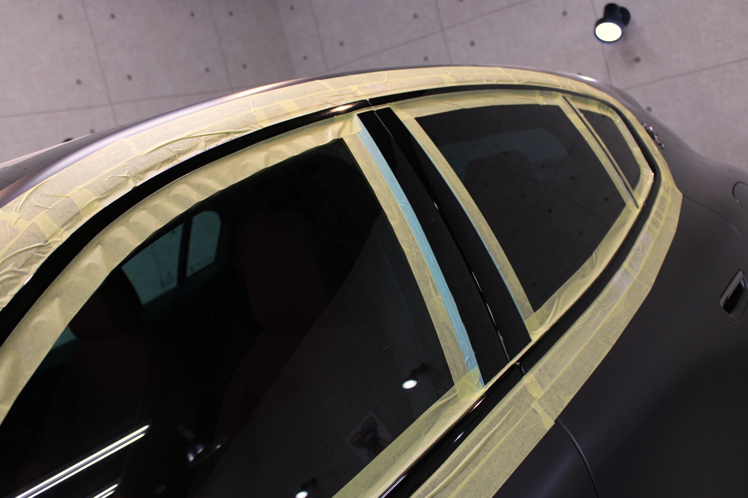 窓のモールを磨く際は、まわりのマット塗装にポリッシャーが当たらない様に厳重にマスキングを施します。